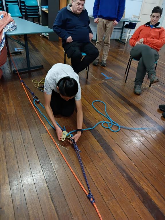 It was a very successful day with 18 participants, including 2 visitors from Armidale who joined us. We were mainly confined to indoor activities, but were still able to practice different types of setups, hauling systems, recovery hierarchy and even managed a practical demonstration of rope strength, slowly cutting through each strand of the static rope until it finally broke.